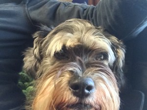 Jeffrey is a schnauzer!  He has a beard!  That should not catch on fire!  Cue panic.  While still holding the scalding pan, and smoke filling the room, and the cats deciding maybe they should rush outside also….